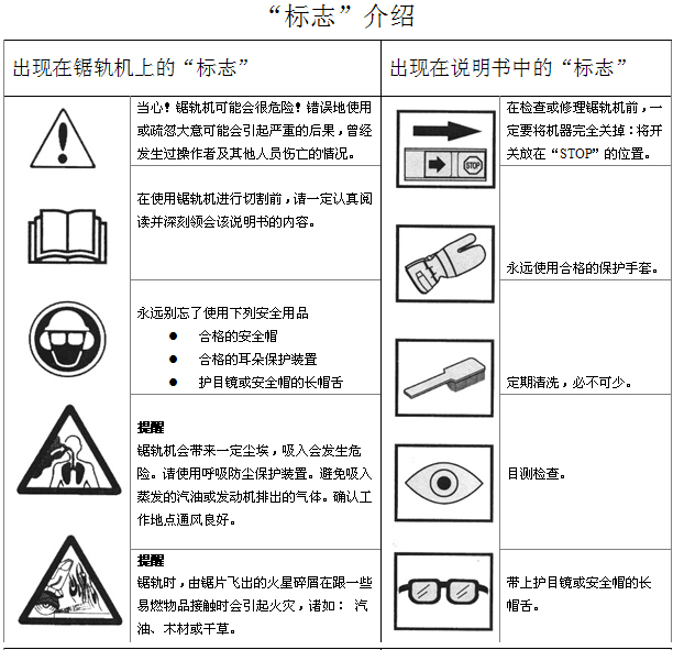 在使用一臺(tái)新的鋸軌機(jī)前: l 從頭至尾,認(rèn)真閱讀操作手冊(cè)。 l 檢查鋸片的安裝及調(diào)整。詳見(jiàn)“安裝”一章。 l 啟動(dòng)發(fā)動(dòng)機(jī)并檢查化油器是否調(diào)節(jié)無(wú)誤。見(jiàn)“保養(yǎng)”一章中“化油器”一節(jié)在空氣/汽油混合正確的情況下,鋸片的停止應(yīng)該是慢慢減速直到最后靜止。緩慢減速的調(diào)節(jié)在手冊(cè)中有說(shuō)明。對(duì)運(yùn)轉(zhuǎn)狀態(tài)的調(diào)節(jié)應(yīng)按此說(shuō)明正確調(diào)節(jié)。在緩慢減速狀態(tài)未正確調(diào)好時(shí),請(qǐng)不要使用鋸軌機(jī)! l 請(qǐng)讓您的Husqvarna的銷售商來(lái)負(fù)責(zé)必要的機(jī)器維修及調(diào)節(jié)。